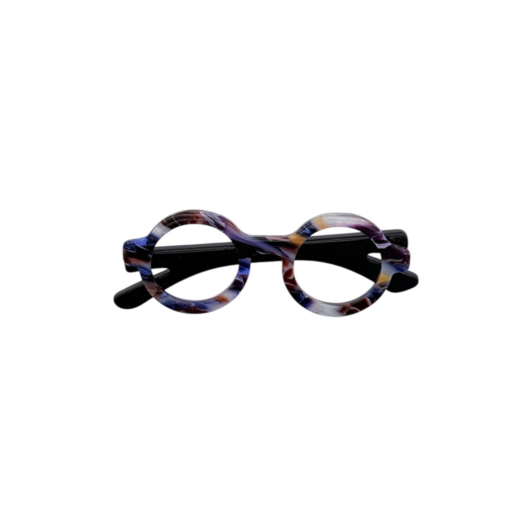 Un broche con carácter y profundidad visual. Este diseño de gafas circulares en resina presenta una mezcla armoniosa de tonos azul oscuro, negro, ocre y blanco, creando un efecto marmolado único y sofisticado. Es el accesorio perfecto para quienes buscan un detalle sutil pero con presencia.