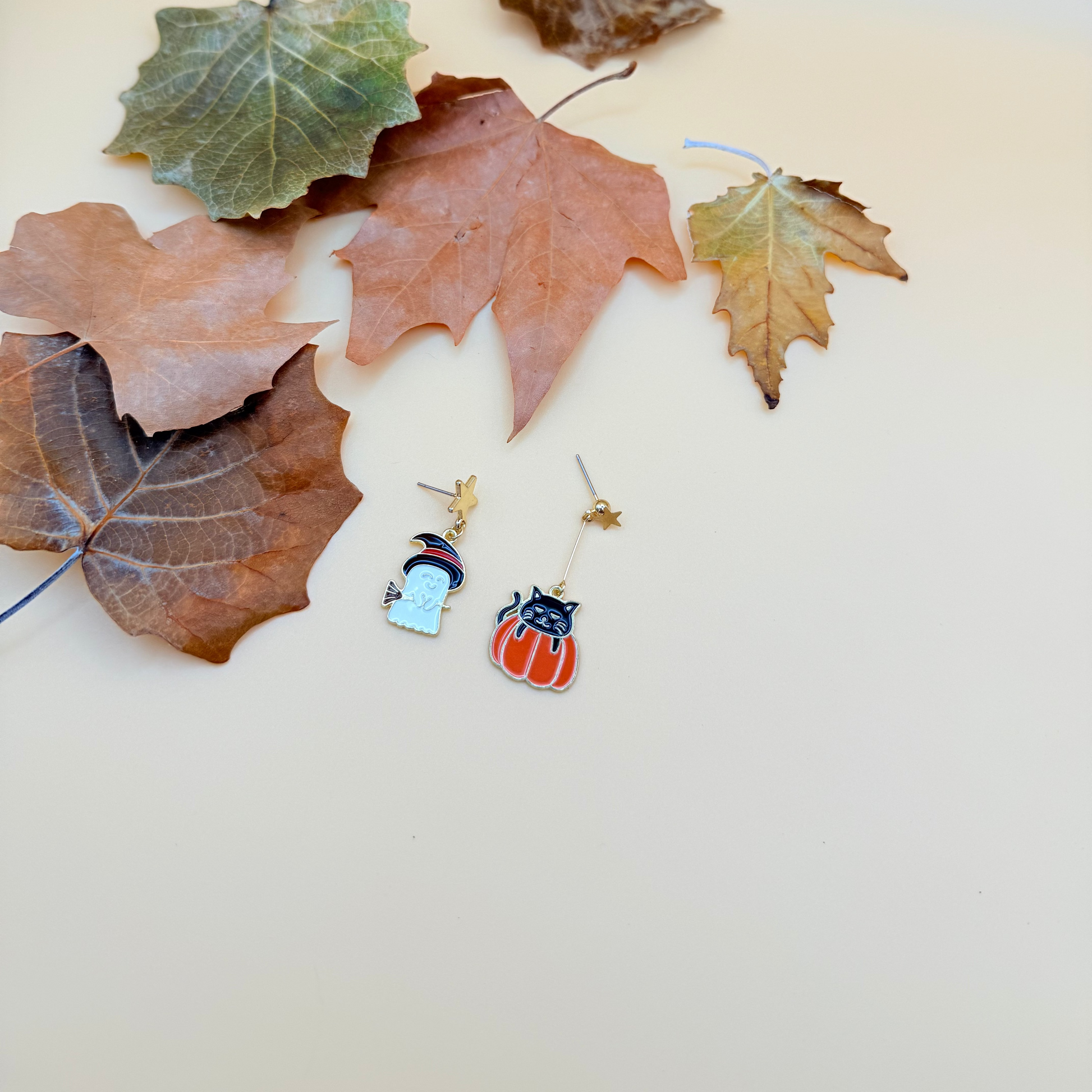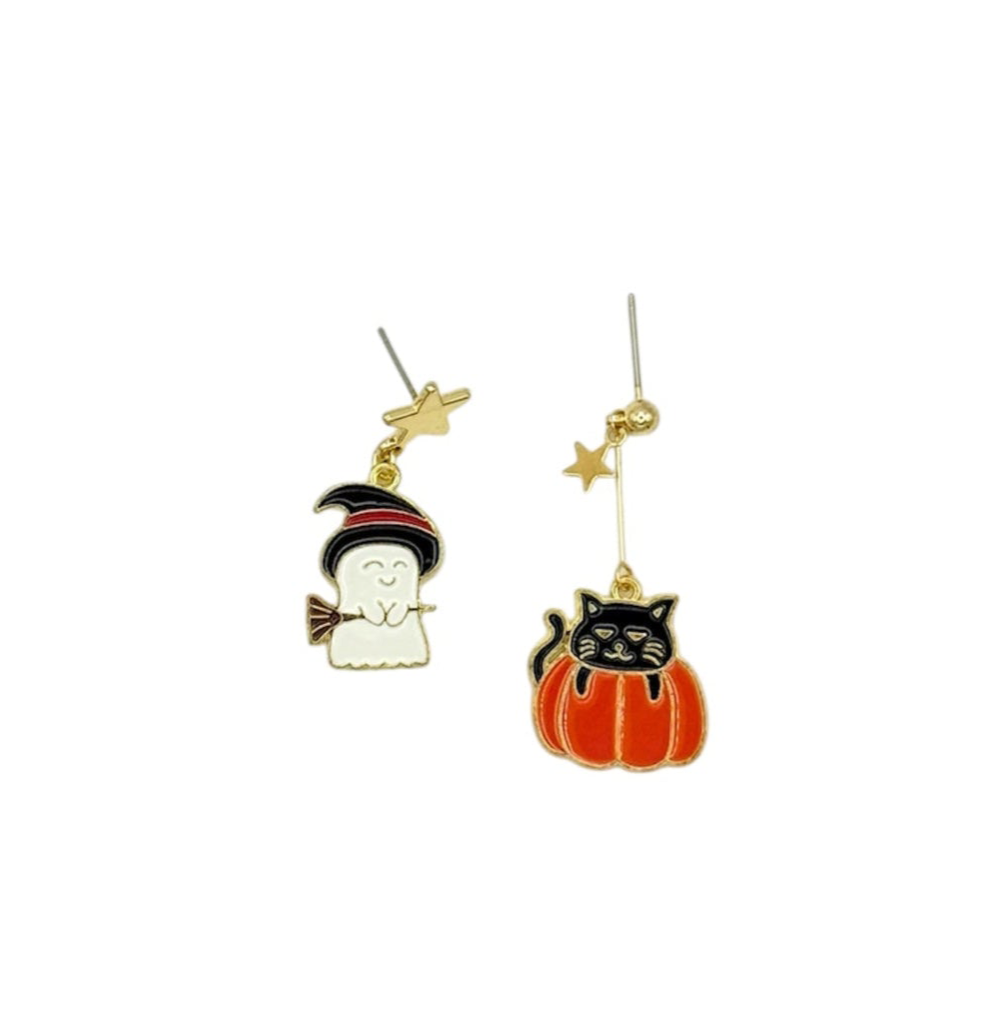 Diseño: Asimétrico – fantasma con sombrero y escoba en un pendiente, y calabaza con gato negro en el otro
