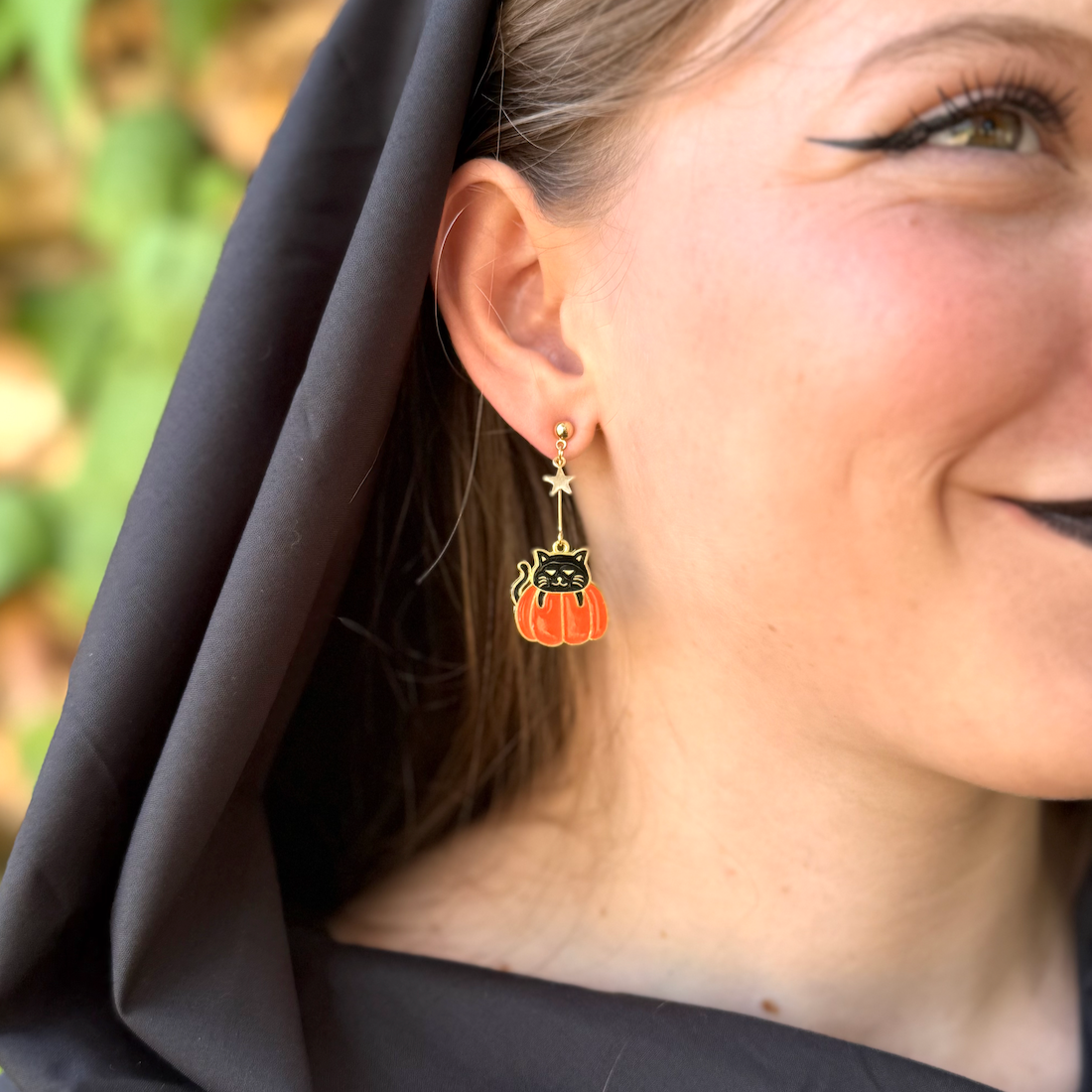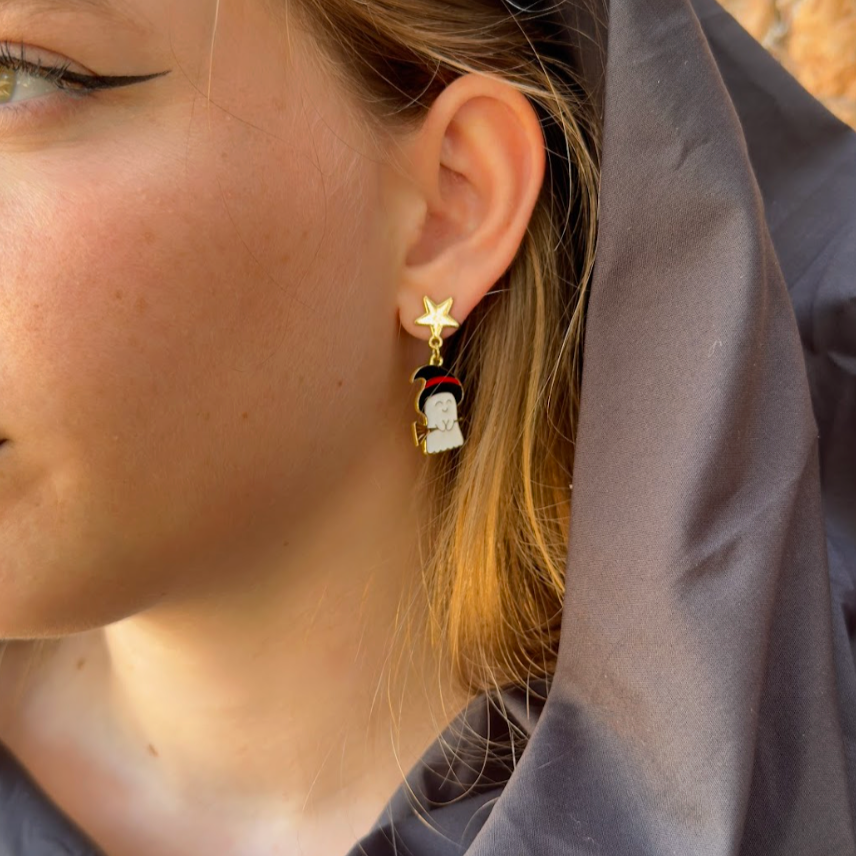 ¡Un toque de magia y diversión para Halloween! Estos pendientes asimétricos de acero inoxidable esmaltado combinan lo adorable y lo misterioso: de una estrella cuelga un simpático fantasma blanco con sombrero y escoba de bruja, mientras que del otro lado, más largo, una calabaza revela a un travieso gatito negro.