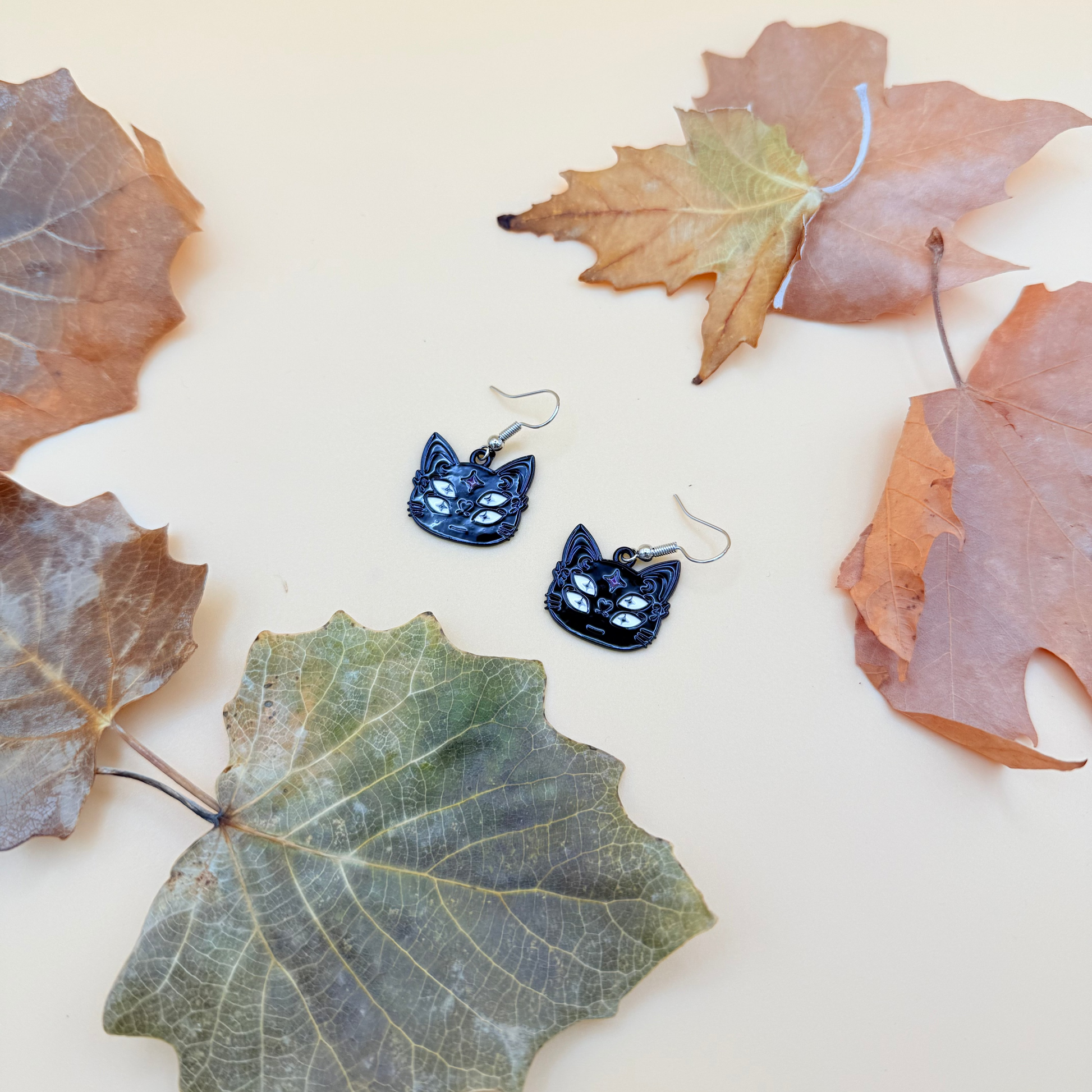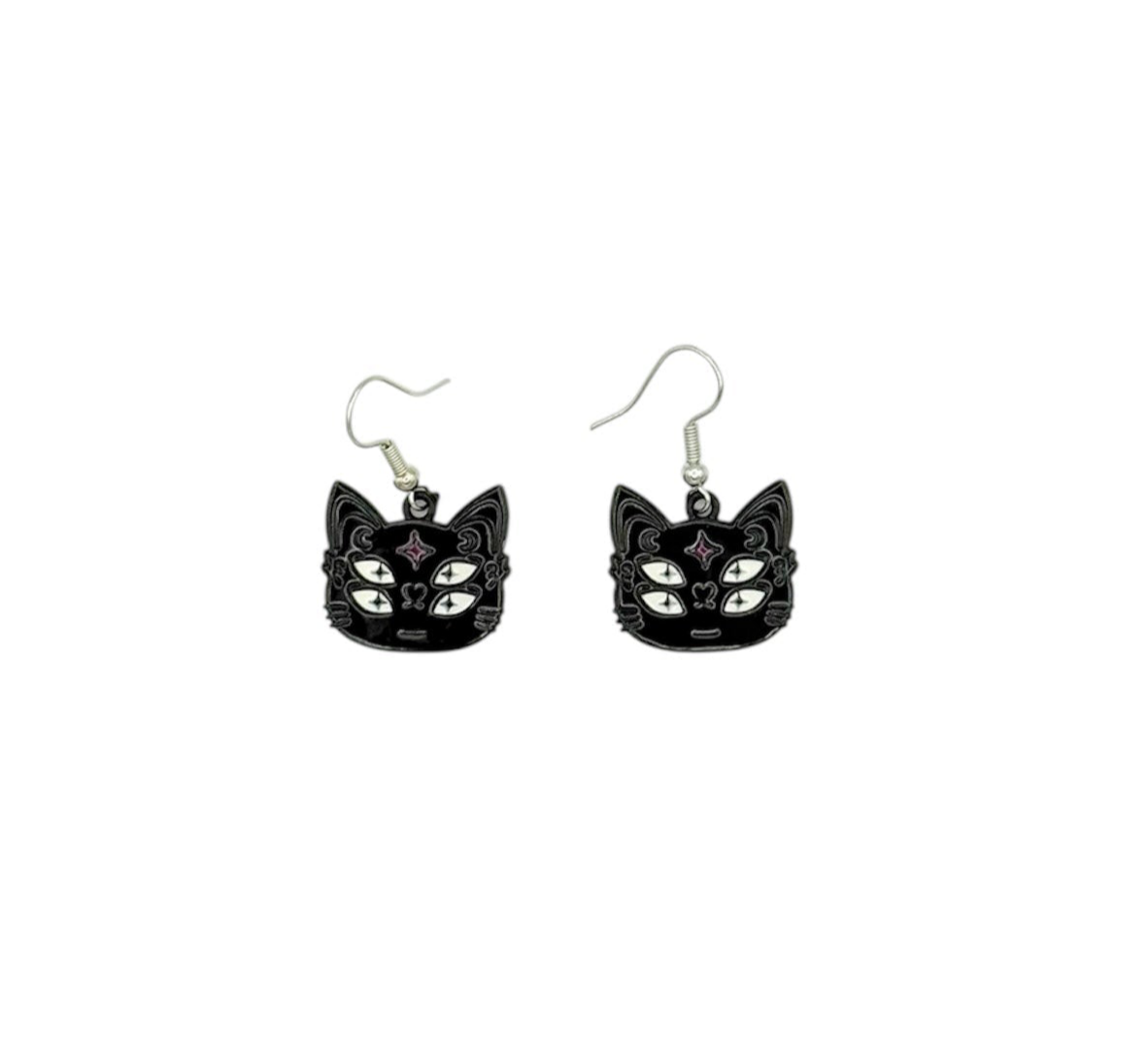 ¡Pendientes llenos de enigma! Cada uno muestra la cabeza de un gato con cuatro ojos, un diseño único que combina ternura y misticismo. Perfectos para quienes quieren destacar con un accesorio diferente en Halloween y todo el año.