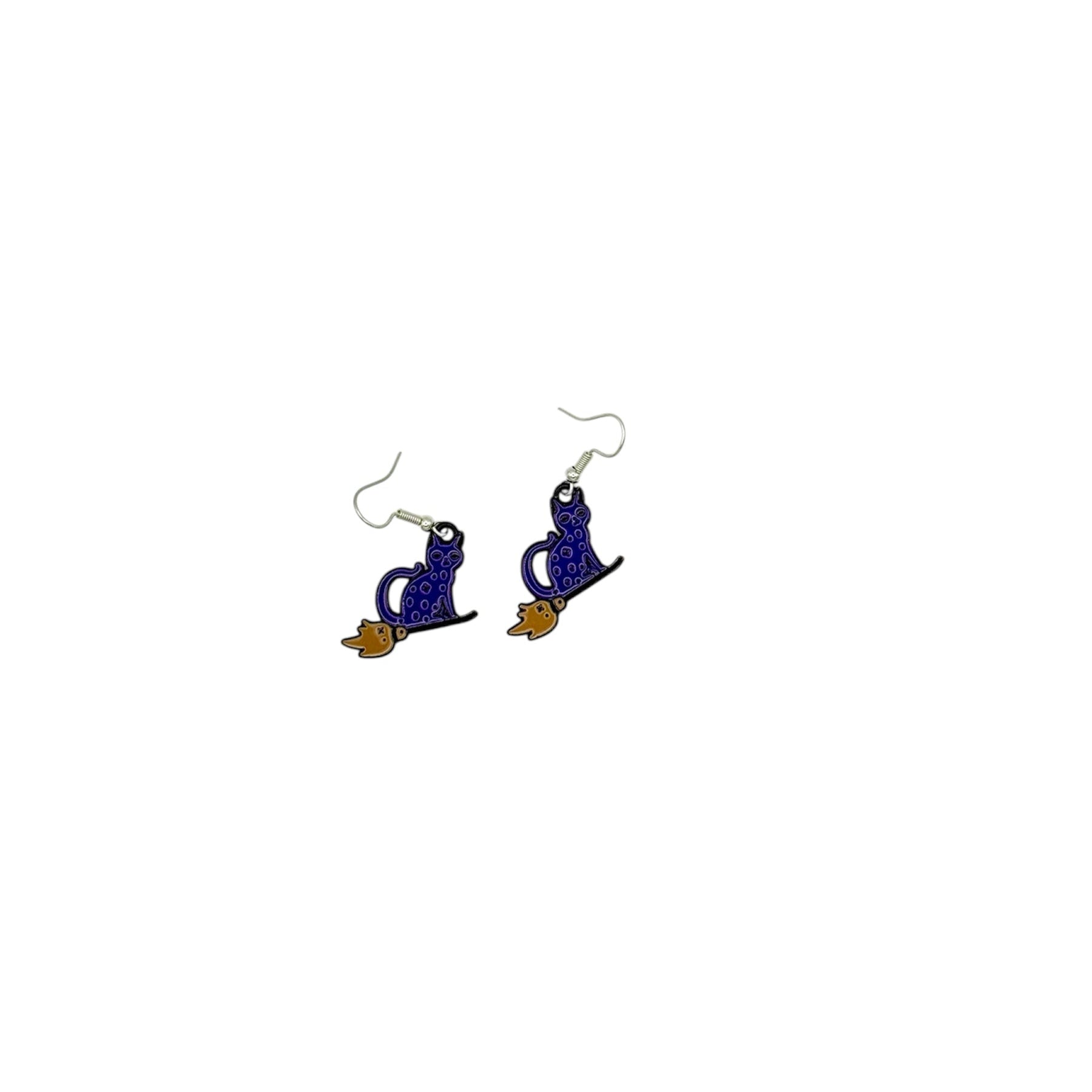 ¡Un toque de magia en tonos únicos! Estos pendientes simétricos de acero inoxidable esmaltado presentan un misterioso gato morado que vuela sobre una escoba de bruja, convirtiéndose en el accesorio ideal para un look divertido y encantado.
