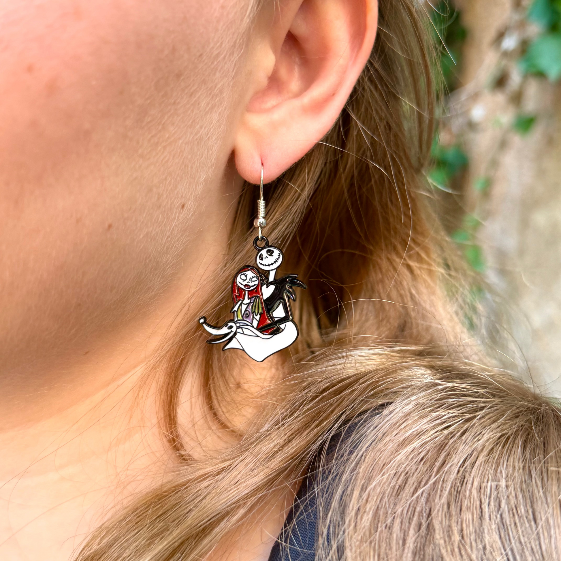 ¡Un accesorio mágico para fans del clásico de Tim Burton! Estos pendientes simétricos de acero inoxidable esmaltado presentan a Jack y Sally mirándose tiernamente, mientras Zero, el fiel perrito fantasma, vuela bajo ellos. Un diseño lleno de encanto y nostalgia.