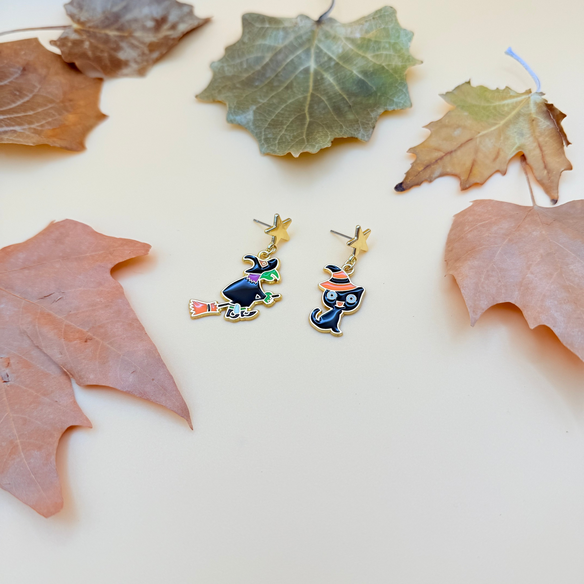 ¡El dúo perfecto para amantes de lo mágico! De un lado, una bruja de piel verde sobre su escoba; del otro, un tierno gatito negro con sombrero de bruja. Ambos cuelgan de estrellas doradas que aportan un brillo especial a tu look de Halloween.