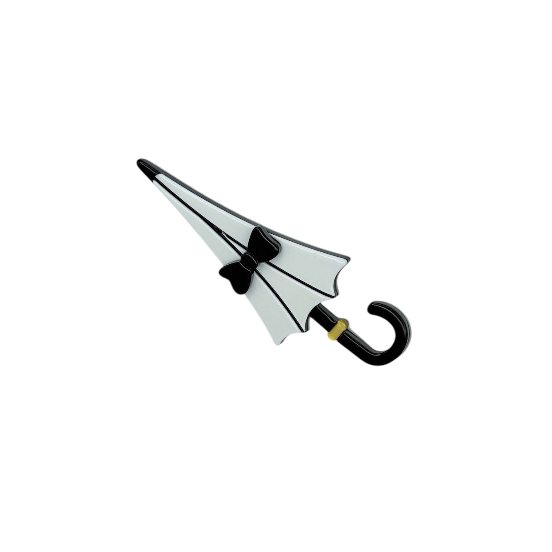 Un accesorio refinado y atemporal. Este broche con forma de paraguas cerrado combina la elegancia del blanco con el contraste del negro en el puño y un delicado lazo en el centro. Su diseño limpio y sofisticado lo convierte en la pieza ideal para añadir un toque clásico y chic a cualquier prenda.