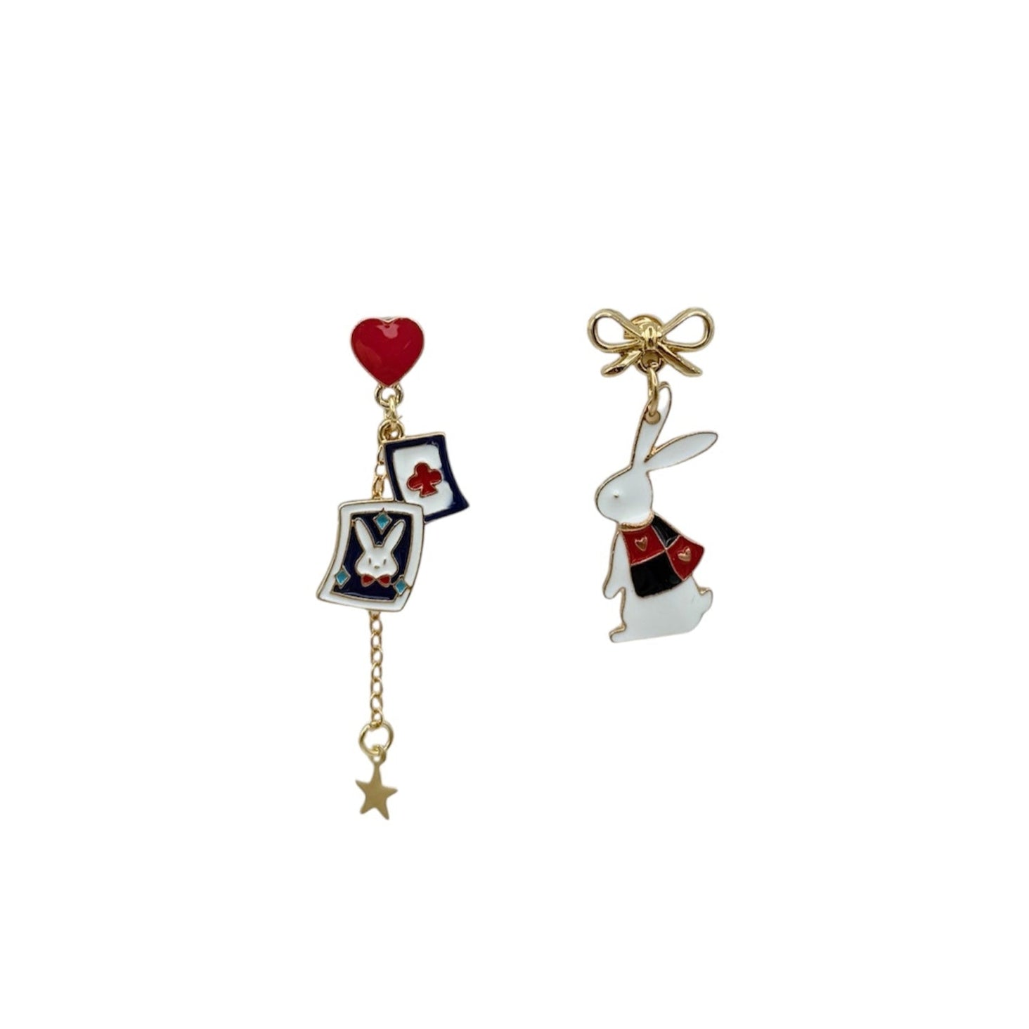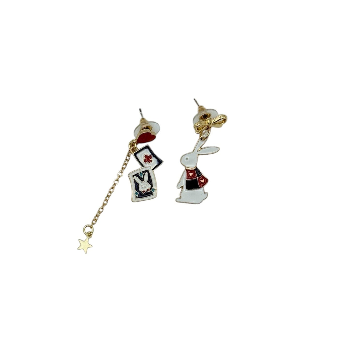 Diseño: Asimétrico – un pendiente con conejo con capa y otro con dos cartas de póker y una estrella colgante