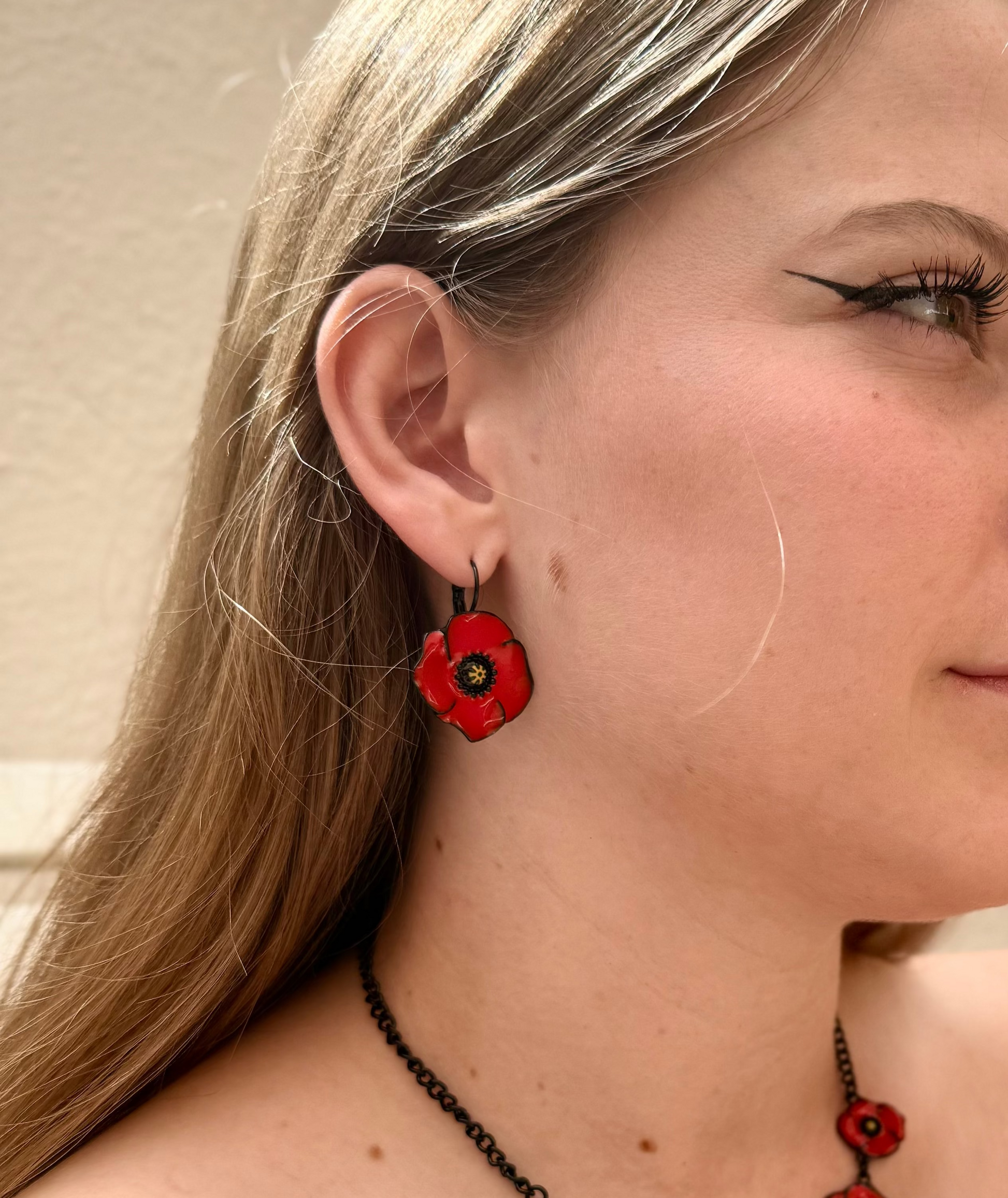 Delicados pendientes con forma de amapola roja, símbolo de belleza natural y sensibilidad. Fabricados en acero inoxidable, completamente esmaltados y libres de níquel, destacan por su color vibrante y su diseño elegante. Un toque floral ideal para complementar cualquier estilo con frescura y distinción.